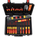 Wiha osnovni set VDE alata za električare. Sa držačima i džepovima za alate. Prostor ispod osnovne ploče za ostali pribor i alate. Ergonomske, dvokomponentne ručke olakšavaju rukovanje. Set sadrži osnovni set alata za zatezanje (kliješta i dlijeto), kao i drugi neophodan profesionalni alat za električare. Pored toga, u kofer možete spakovati i vlastite alate i pribor do težine 14 kg. Ukupna zapremina kofera je 12 l.Sigurnost na radu: Izdržljiv, polipropilenski kovčeg sa IP67 zaštitom, otporan na prašinu i podnosi trenutno uranjanje u vodu. Zaaključavanje pomoći sifre.