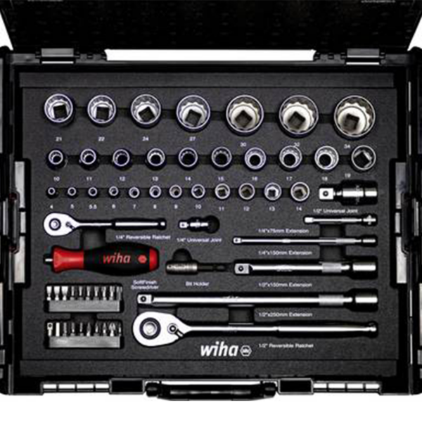 Za radove uvrtanja i montaže potrebno je mnogo različitih profila. Wiha set nasadnih ključeva od 60 komada nudi korisniku širok izbor najčešćih uložaka nasadnih ključeva od 1/4″ i 1/2″ u veličinama od 4 – 14 mm kao i 10 – 34 mm. Tako korisnik dobiva svaki navojni spoj jednostavno zašrafljen ili otvoren. 19 nastavki, držač za bitove, dva ključa sa čegrtaljkom, četiri nastavka i dva kardanska zgloba zaokružuju komplet i omogućavaju korisniku veoma obimnu opremu za montažne i montažne radove.
